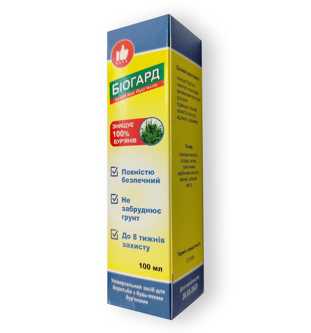 Біогард – натуральний засіб, який знищує до 99% трави, полегшує працю городника, відлякує шкідників і як найкраще підживлення насичує всі частини рослини корисними компонентами. Діє вибірково. Проникає тільки в листя і стебла, досягаючи коріння, призводить до їхнього засихання. Підходить для овочів, зелені, квітів та інших культур. Однієї обробки вистачить на весь сезон, але навіть при повторній необхідності він не нашкодить здоров'ю, якщо людина вживає їх в їжу.