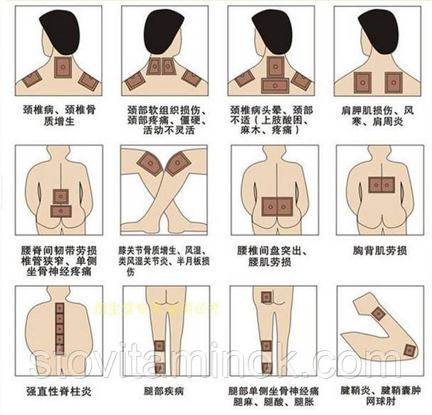 Показання до застосування: біль, спричинений ревматизмом, ревматоїдним артритом, цервікальною спондилопатією, хворобами поперекових хребців, периартритом плеча, гіперостозом і ушкодженням м'яких тканин.
